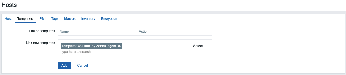 Введите в поле Search (Поиск) и затем выберите его из списка, чтобы добавить этот шаблон в хост.
