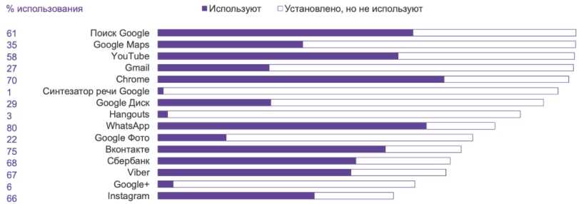 Это видно из диаграмм ниже: у Google 6% использования, у синтезатора речи – 1%, при этом оба приложения находятся в топе установок.