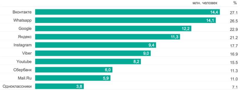 ВКонтакте, как крупнейшая платформа для общения на территории СНГ, ожидаемо лидирует. На втором месте стоит WhatsApp – самый крупный мессенджер в мире (да, он обгоняет Telegram даже на территории СНГ).