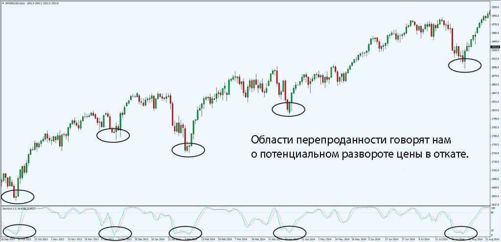 Когда цена находится в восходящем тренде, мы ищем точки входа на откатах. Но когда именно закончится откат, и тенденция продолжится? В этом нам поможет индикатор стохастик.