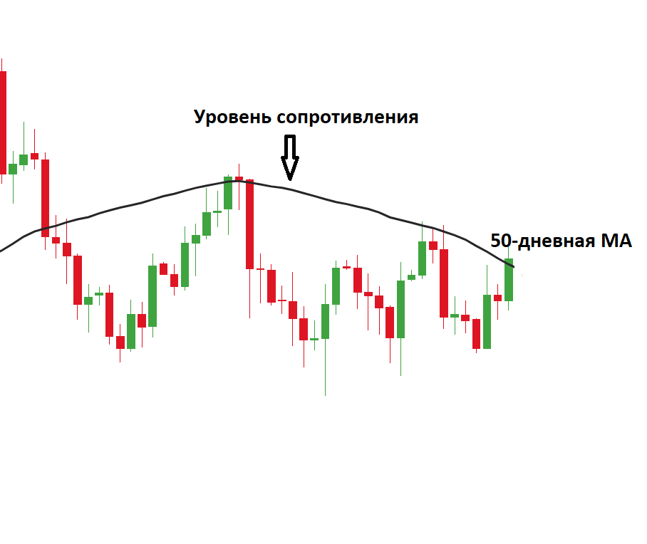 Примечательно, скользящая средняя выступает в качестве уровня сопротивления, когда цена актива находится ниже ее. Если скользящая средняя находится выше цены актива, то это потенциальный уровень поддержки.
