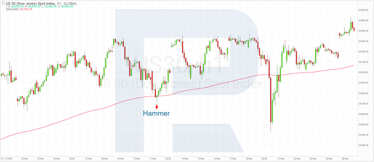 Пример для открытия позиции на покупку: котировки после роста формируют откат к уровню поддержки, которым является EMA 200, а после достижения поддержки цена формирует разворотный паттерн Молот. После закрытия свечи можно открывать позицию на покупку. При этом Стоп Лосс выставляется за минимальное значение Молота, а Тейк Профит — на ближайшее максимальное значение.