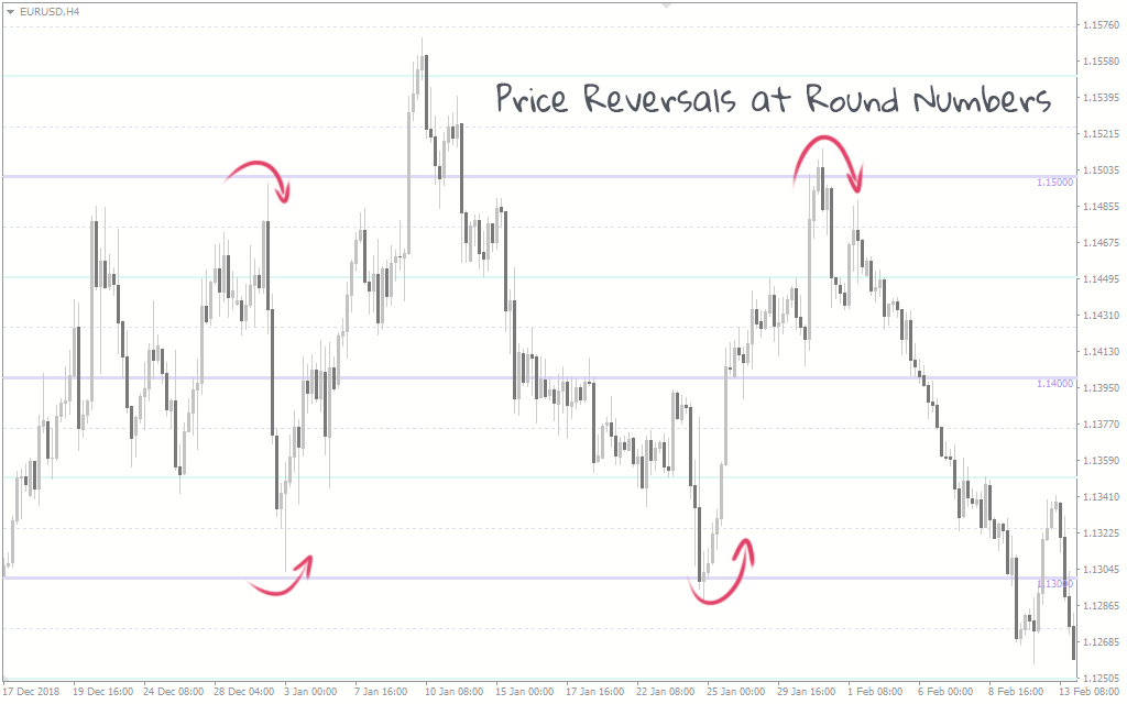 Хотя уровни больших круглых чисел зачастую выступают в роли точек поддержки и сопротивления, все же интересно понаблюдать, как иначе цена реагирует на них даже на текущем тренде. На графике ниже показано, что большинство изображенных на нем разворотов цены совпадают с уровнями круглых ценовых значений.