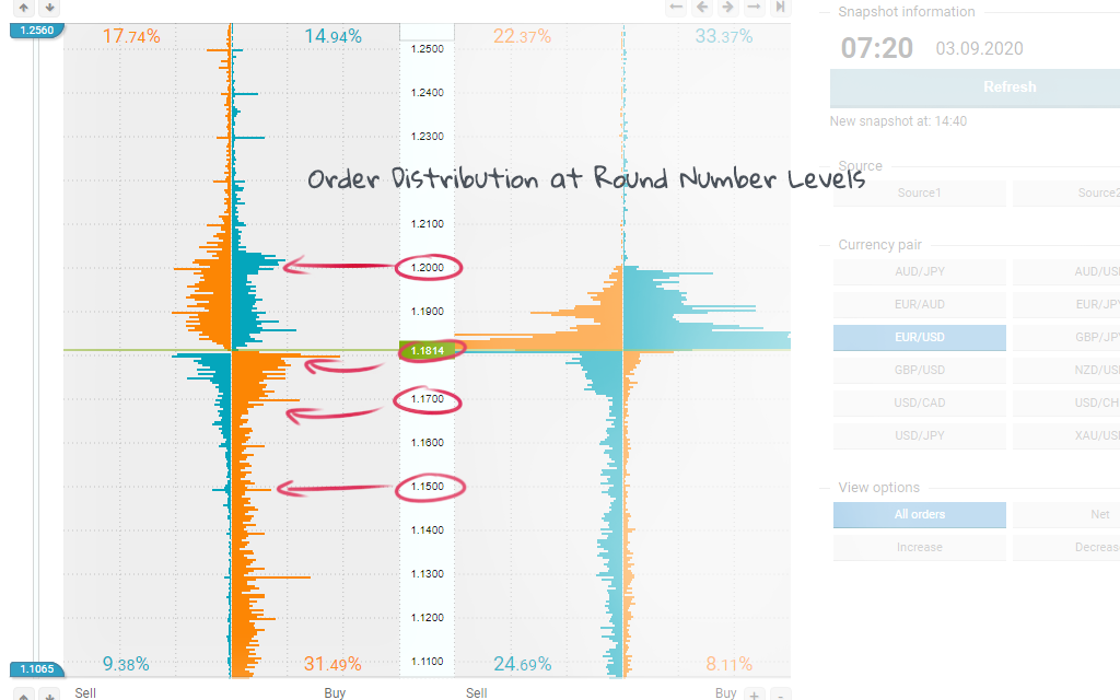 Обратите внимание на изображение ниже, которые мы взяли из нашего инструмента DOM Snapshots, где показано, как происходит скопление ордеров на круглых уровнях