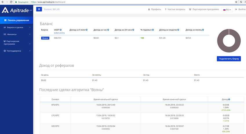 Это площадка, рассчитанная на работу с API-ключами наиболее известных криптовалютных бирж. Здесь можно корректировать торговые стратегии, а также вести межбиржевой арбитраж. Причем в последнем случае применяется схема «Зеркала». За пользование данным сервисом придется заплатить половину от полученной прибыли. На ApiTrade будет весьма комфортно работать новичкам. Чтобы арбитраж криптовалюты оказался действительно прибыльным, нужно выбирать активы с самыми дешевыми транзакциями.