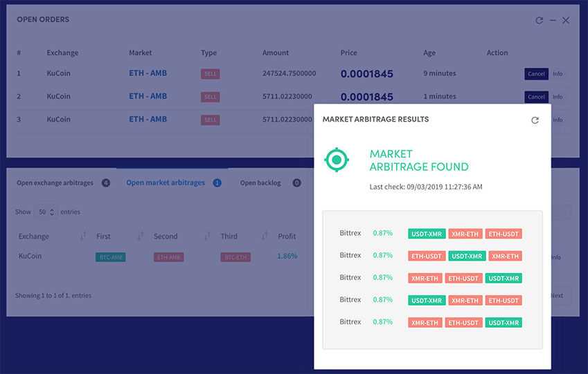 Программа с многочисленными настройками, ориентированная на трейдинг. Тем не менее, включает возможность проводить арбитражные сделки из трёх криптопар внутри одной биржи.