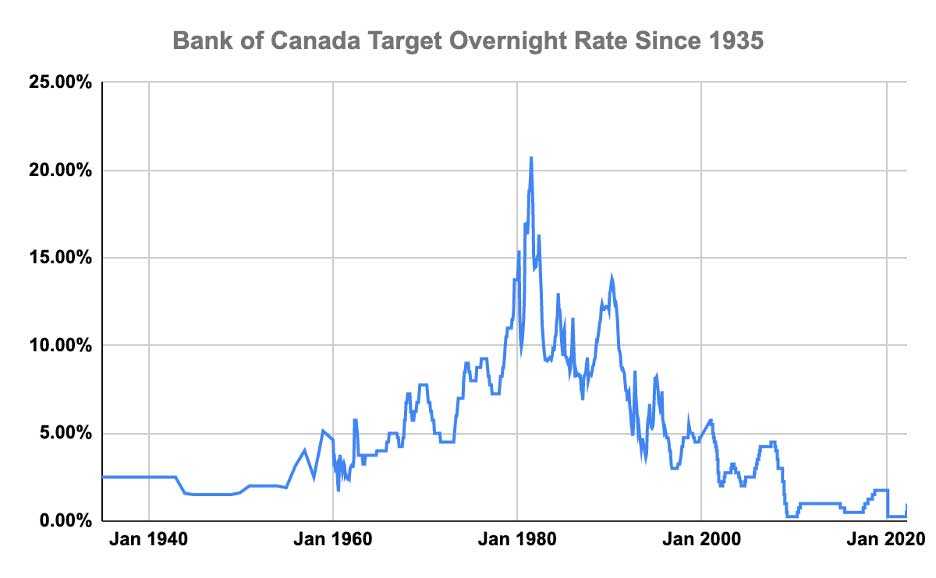The Great Depression was a global social and economic crisis in the early 1930s. Canada, in particular, was badly affected by high levels of unemployment, bankruptcy and homelessness at the time. The Bank of Canada’s interest rate began at 2.5% in 1935. By the end of World War 2, it had dropped to 1.5%, and the economy had strengthened significantly during the war.