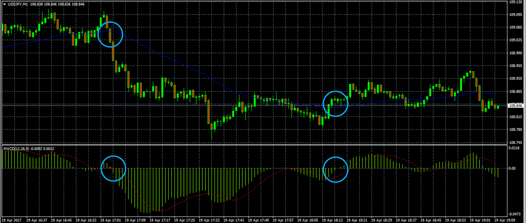 Основным индикатором для нас является MACD. Скользящую среднюю мы используем только для подтверждения получаемых торговых сигналов. Итак, следим за гистограммой MACD. Нас интересует момент, когда бары индикатора пересекают нулевую отметку.