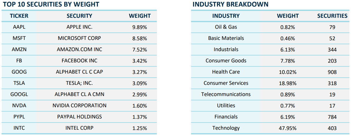 Анализ корзины по секторам указывает на явное доминирование технологической отрасли. На нее приходится чуть меньше 50%, формально в индексе есть и финансовый сектор, и сфера здравоохранения, и представители промышленности, но их «вес» невелик.