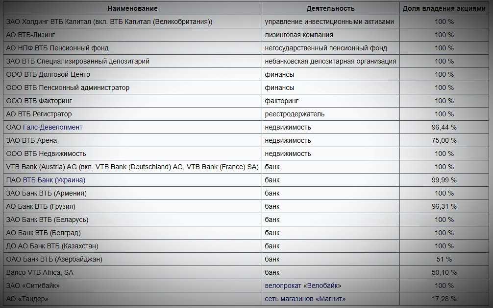Приведём вам список дочерних компаний, которыми владеет ВТБ: