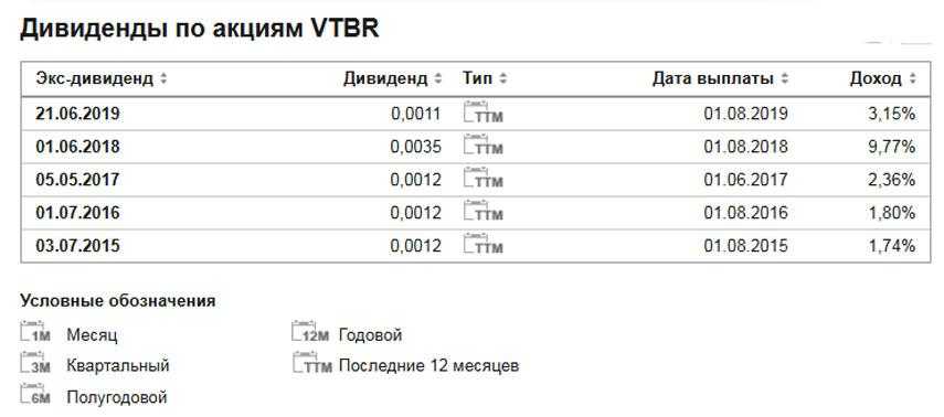 В прошлом году многие эксперты объявили ВТБ бесперспективным. В текущем году планируется резкое снижение дивидендов по сравнению с предыдущим. Выплаты на одну акцию 4 июня 2018 года составили 0,0034535 рубля, что обеспечило наибольшую с 2010 года доходность в 6,98 %. В этом году (на 18 июня) показатели составили 0,0010987 рубля и 2,7 % соответственно.