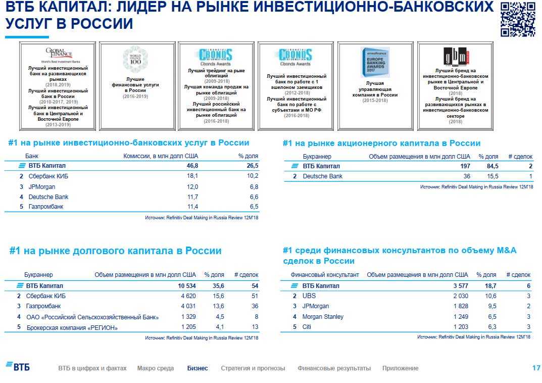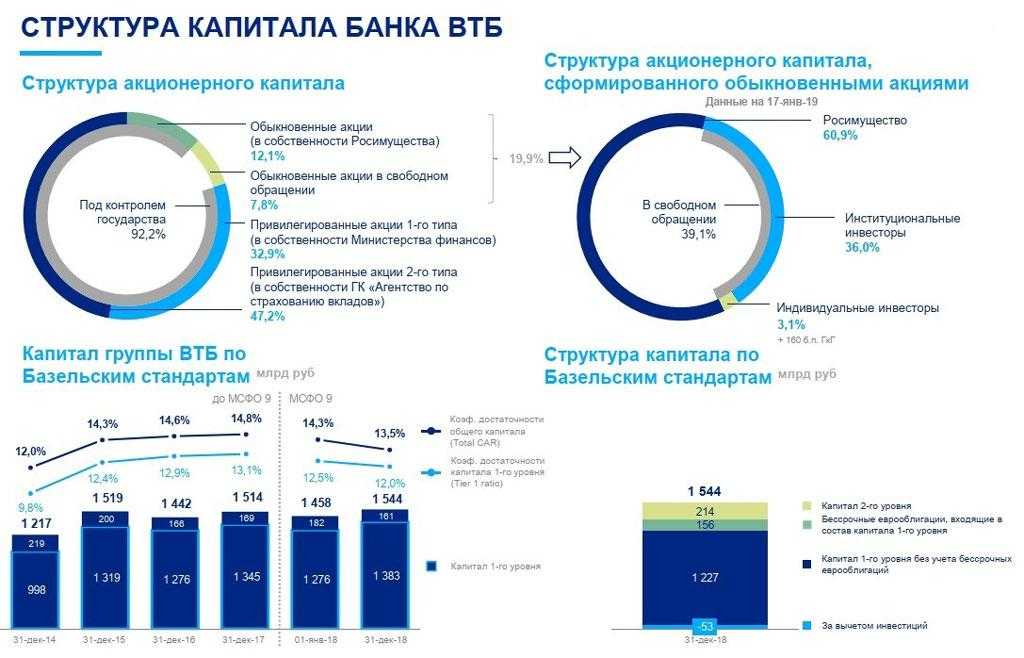 Общая доля государства в уставном капитале превышает 92%. Сегодня ВТБ занимает второе место среди банков России по размеру активов и выданным кредитам. У брокерской компании третье место по числу активных клиентов на Московской бирже и второе на Санкт-Петербургской.