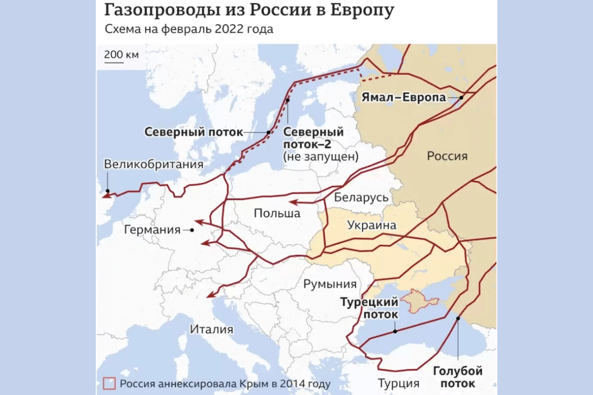 Карта основных маршрутов российских газопроводов в Европу, по состоянию на февраль 2022 (источник Русская служба BBC News, Газпром и Еврокомиссия):
