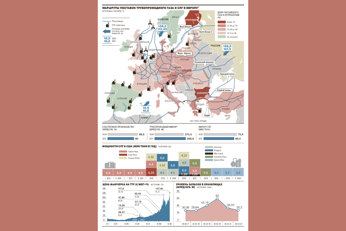 Издание «КоммерсантЪ» представляет следующую карту поставок трубопроводного газа и СПГ из России в Европу: