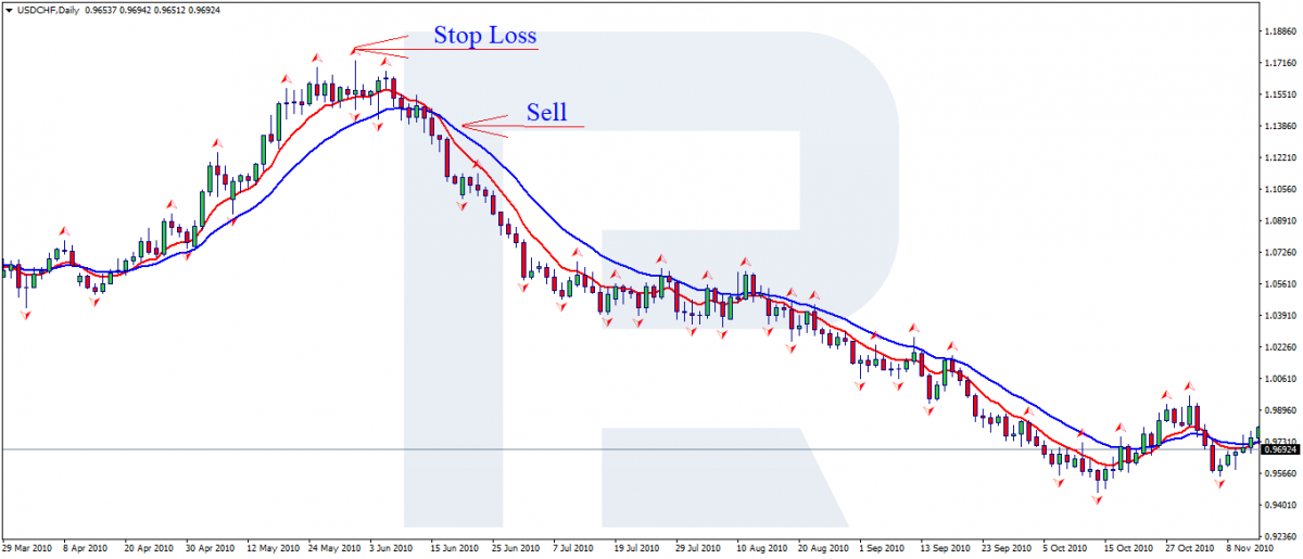 Возьмем для очередного примера самую простую стратегию на основании двух Скользящих средних и индикатора Fractals. Трейдеру поступает сигнал на продажу после пересечения двух мувингов, далее после открытия сделки выставляется Стоп Лосс. Целевым ориентиром для Стоп Лосса будет максимальный фрактал (таким образом можно обезопасить сделку от ложных пробоев и движений). Закрыть сделку необходимо в момент, когда Скользящие средние пересекутся в обратном направлении. Учитывая, что место пересечения на момент открытия позиции не известно трейдеру необходимо вручную передвигать Стоп Лосс за ценой при этом удерживать его на определенном расстоянии.