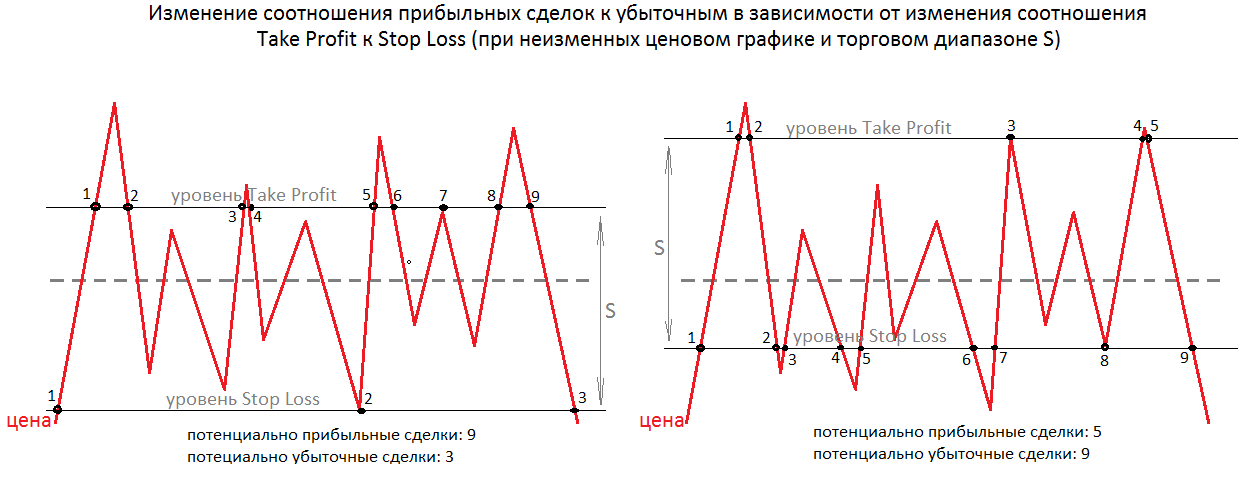 В этом случае даже при равных значениях Take Profit и Stop Loss, можно находиться в прибыли (и иметь к-т profit factor > 1.5) только за счёт большего количества прибыльных сделок.
