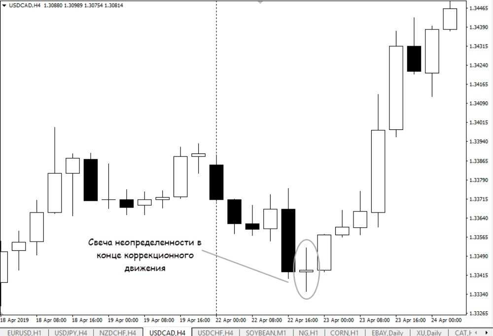 Разберем процесс формирования паттерна Доджи. На Н4 модель появилась в конце коррекционного движения.