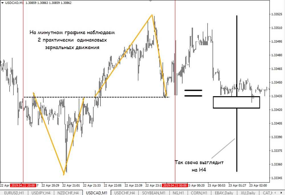 Паттерн сформировался на Н4, спустимся на младший таймфрейм и посмотрим, как формировалась конструкция