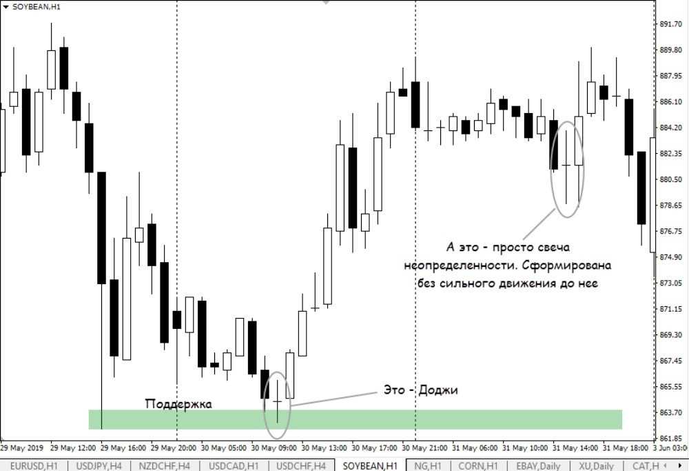 Каждая свеча доджи образуется лишь в том случае, когда цены открытия и закрытия каждой подобной свечи одинаковы. Это говорит заинтересованным людям о том, что рынок находится в состоянии неопределенности.