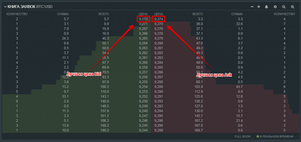 - Заявки на покупку, они же биды (от англ. bid — предложение) расположены снизу и выделены зеленым.