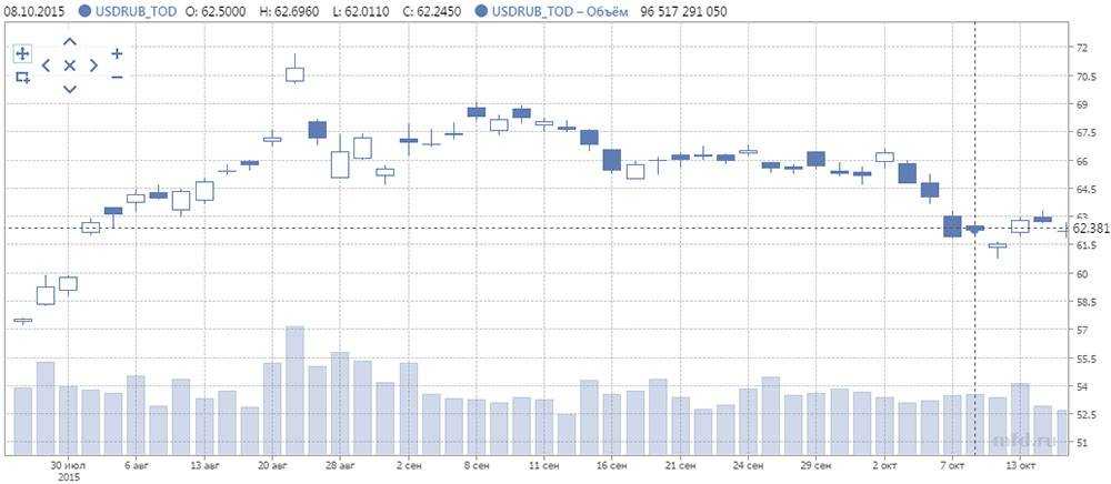 Рассмотрим практический пример торговли опционами. На графике пары USDRUB (биржевой инструмент USDRUB_TOD) можно увидеть незакрытый гэп вверх от 03.08.2015 г, незакрытый гэп вверх и вслед за ним вниз от 24.08.2015 и новый гэп вниз, образовавшийся 07.10.2015: