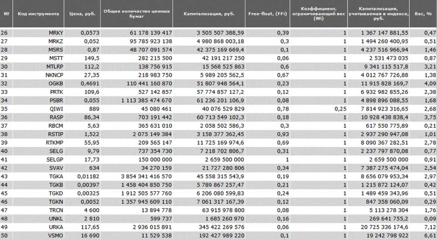 На репликацию (копирование) всего индекса MOEXBC понадобится порядка 50-60 тысяч рублей – при условии, что будет куплен минимальный объем каждой бумаги. Если же соблюдать пропорции, заданные в индексе, то понадобится гораздо более существенная сумма – более 540 тысяч рублей.