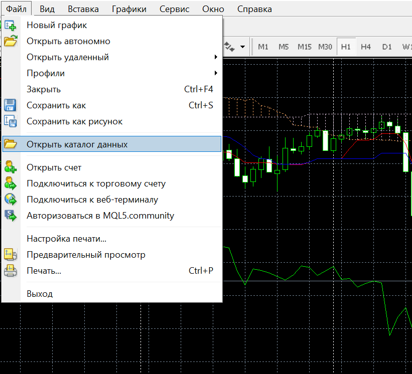 - Далее в терминале нажимаем файл и открываем каталог данных