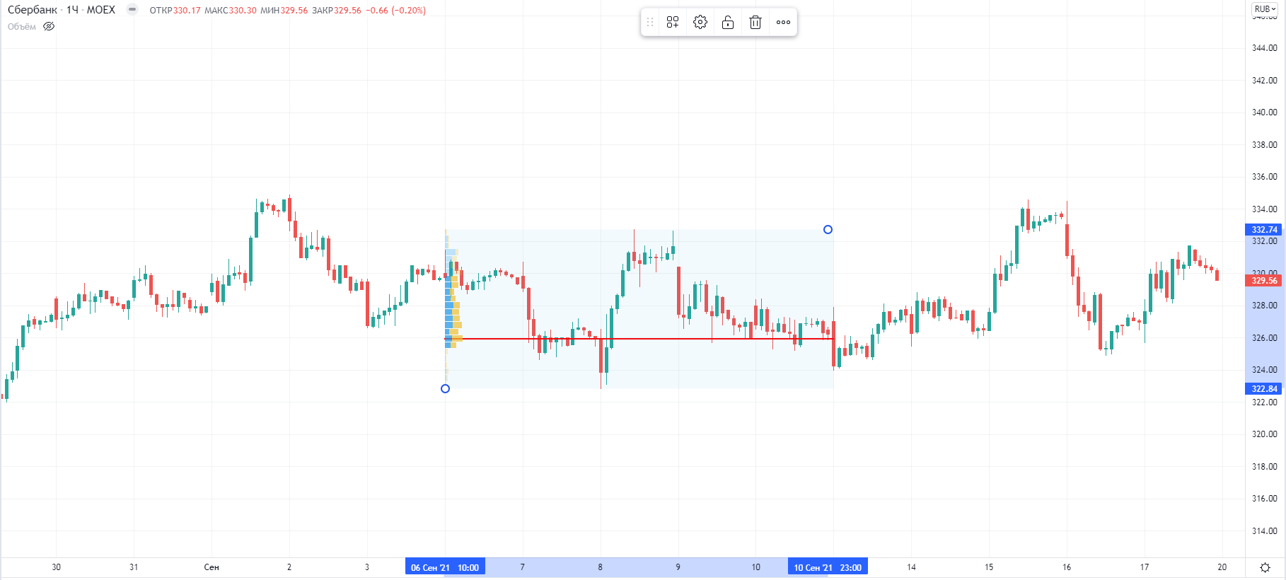 Взять и случайно наложить на график фиксированный диапазон будет глупо. Есть некие закономерности. Если вы к примеру внутридневной трейдер, можно использовать POC за предыдущий день, неделю или месяц. Но, например, неделя должна начинаться не со среды или четверга, а с понедельника. Тоже самое и с месячным POC. Опять же подчеркну, это не мои личные идеи, а общие рекомендации. Посмотрим, как это выглядит на графике.