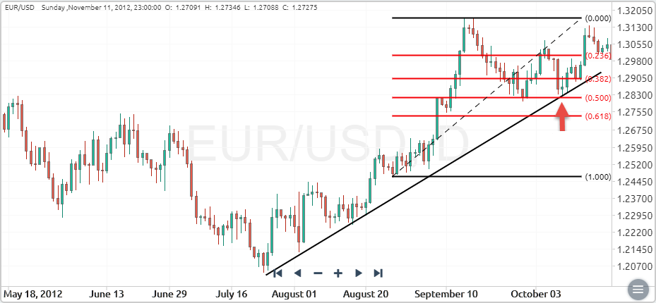 На приведенном выше графике показана пара EURUSD во время восходящего тренда с восстановлением цены на уровне отката 50%. Этот уровень сформировал зону поддержки от растущей линии тренда, что создало большую вероятность для входа в сделку на покупку.