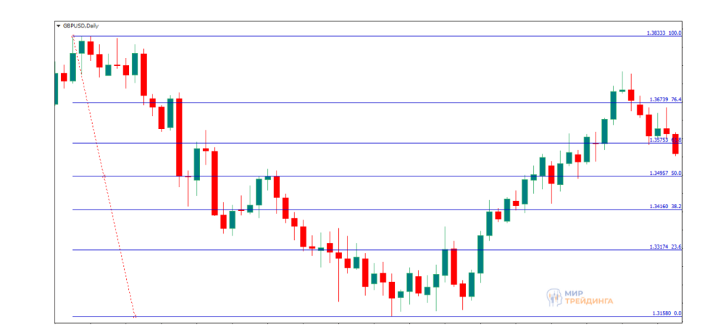 - Второстепенные уровни. Это 23.6%, 50% и 76,4%. Цена реагирует на них, однако они не столь важны в торговле, если рассматривать небольшие таймфреймы.