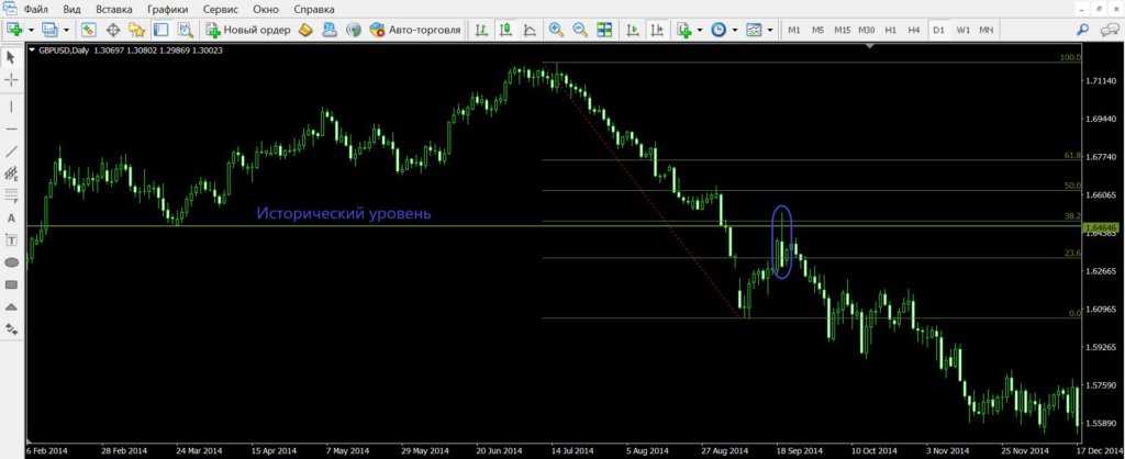 Например, на скриншоте выше после трендовой нисходящей волны цена сделала коррекцию наверх. Она дошла до исторического уровня, от которого по дневному графику был явно заметный отскок. Синим овалом обозначен день, когда цена на коррекции вновь показала, что на этом уровне есть игроки, желающие продавать. Об этом сигнализирует большая верхняя тень дневной свечи. И в дополнение ко всему этому в области этого уровня расположен уровень 38,2 по Фибоначчи. Когда есть несколько подтверждений, тогда более уверенно можно входить в рынок. И здесь видно, что продажи от этого уровня себя оправдали, движение цены вниз продолжилось.