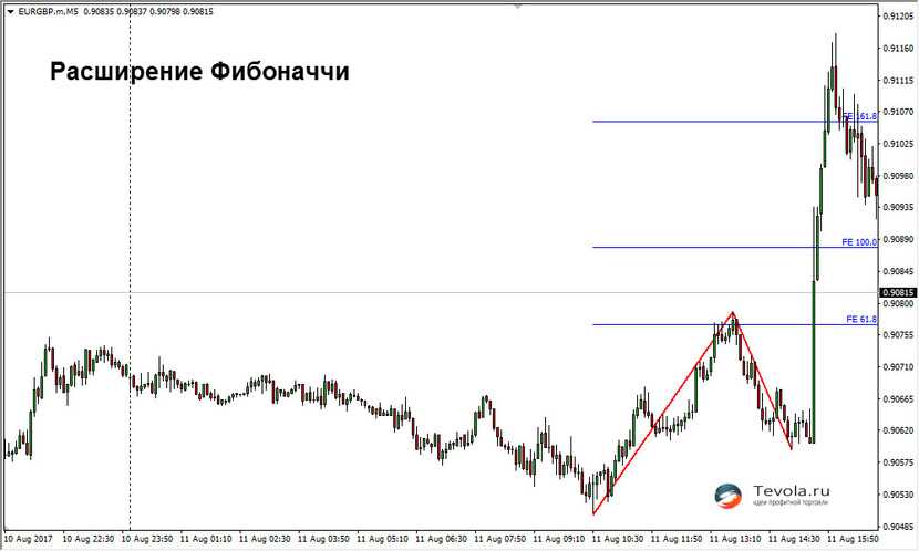 Есть очень один важный аспект применения фибоначчи, о котором стоит рассказать – расширение фибоначчи. Это те же уровни с теми же коэффициентами, но рассчитываются и накладываются они не для поиска окончания коррекции, а наоборот, для следующего трендового движения. Проще говоря, с помощью этого расширения мы прогнозируем длину следующей трендовой волны. Есть первая волна тренда, далее коррекция, после чего начинается третья волна. Вот ее и рассчитывают с помощью расширения фибоначчи. Это также стандартный инструмент технического анализа, доступный в МетаТрейдер 4 и 5.