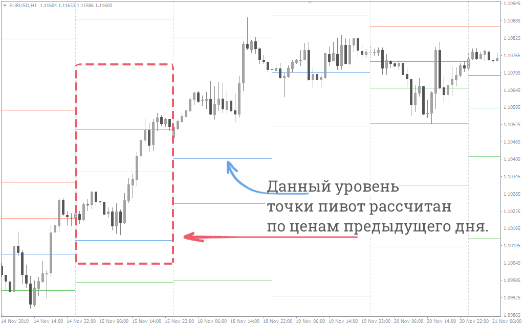 На графике мы видим, как индикатор Pivot Points использовал данные за 15 ноября (пятница), чтобы определить уровень точки пивот для 18 ноября (понедельник). Он нанес ТП на график в виде зеленой линии.