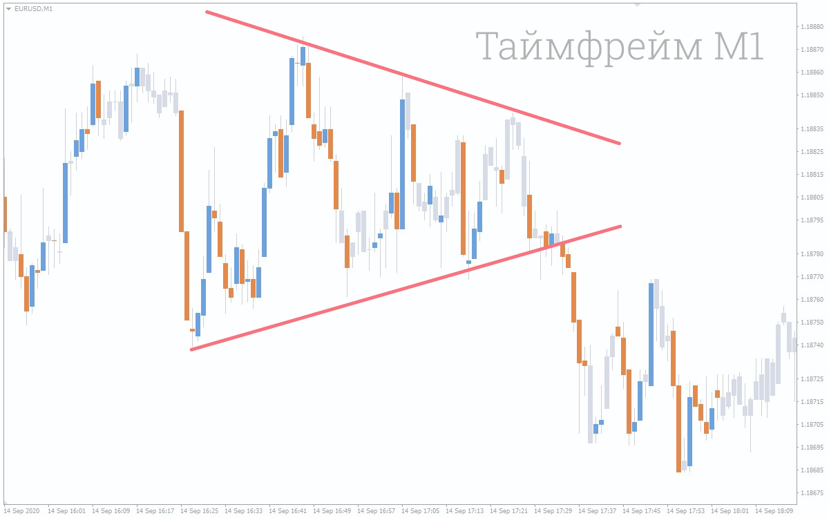 Обычно на таймфрейме M1 рынок практически все время находится под воздействием рыночного шума. Такое состояние рынка легко определить на графике: тренд отсутствует, цена движется хаотически и сумбурно. Для примера давайте посмотрим на график валютной пары EUR/USD на таймфрейме M1: