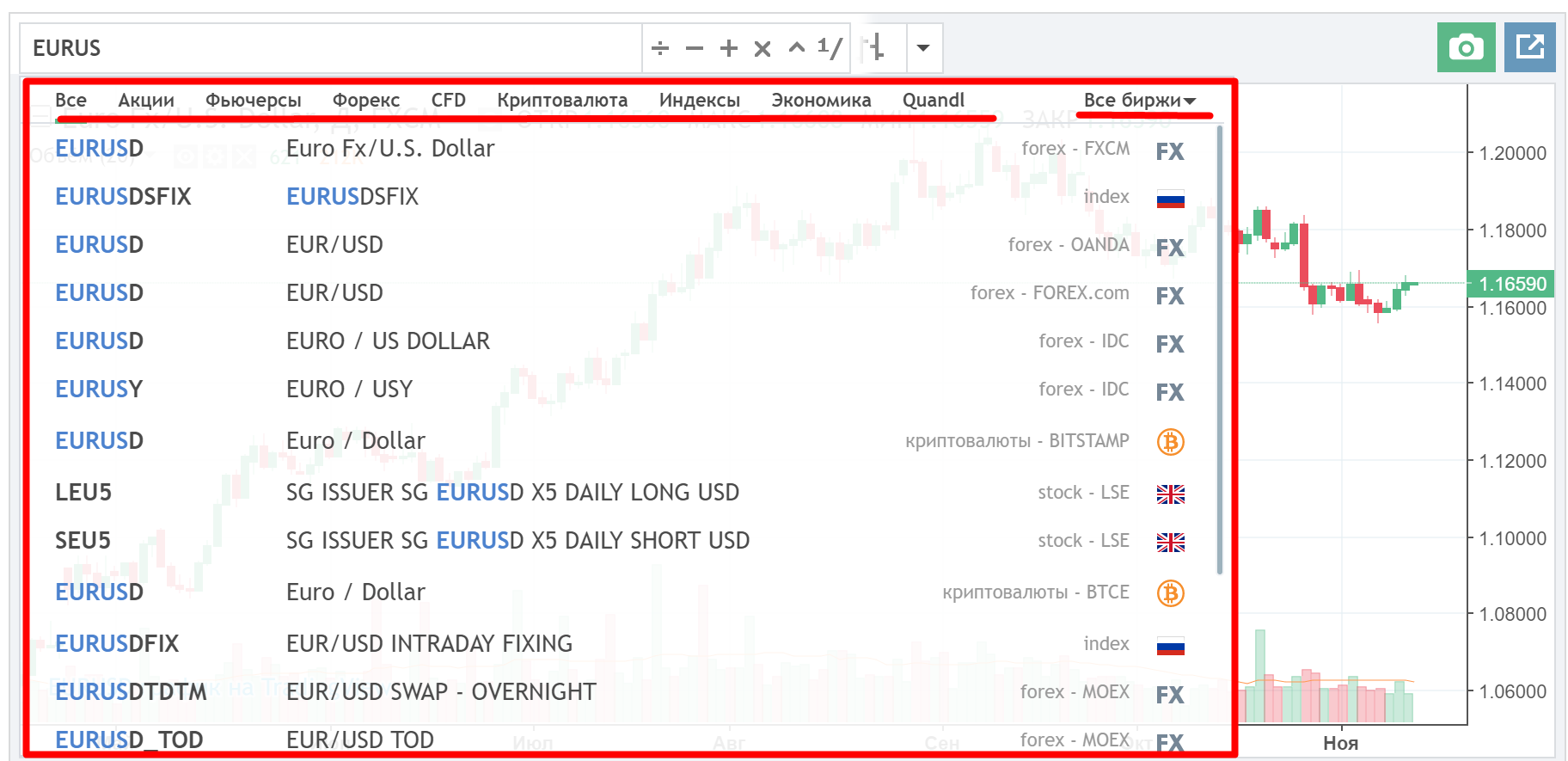 Если Вы хотите найти какой-то определенный инструмент, но не знаете, как пишется его тикер, то советуем перейти в наш раздел с котировками, где мы собрали самые популярные инструменты на одной странице. Там Вы с большой вероятностью найдете то, что ищете. Обнаружив интересующий инструмент – просто кликните на его название и желанный график откроется.