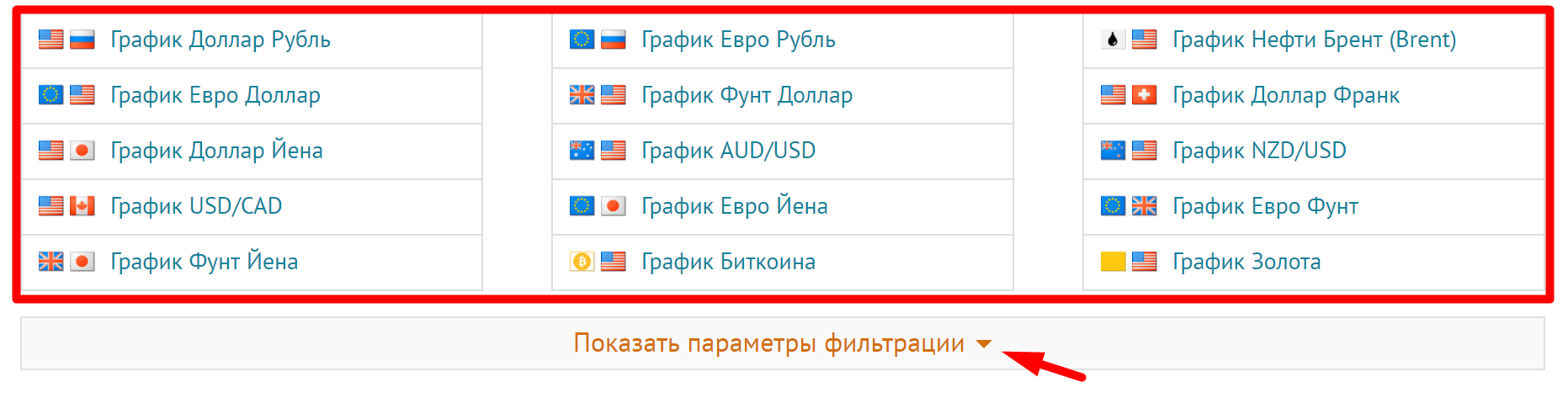 Если Вы не нашли то, что искали – раздвиньте область с инструментами, кликнув на кнопку «Показать параметры фильтрации». В ней Вы увидите большее количество инструментов.