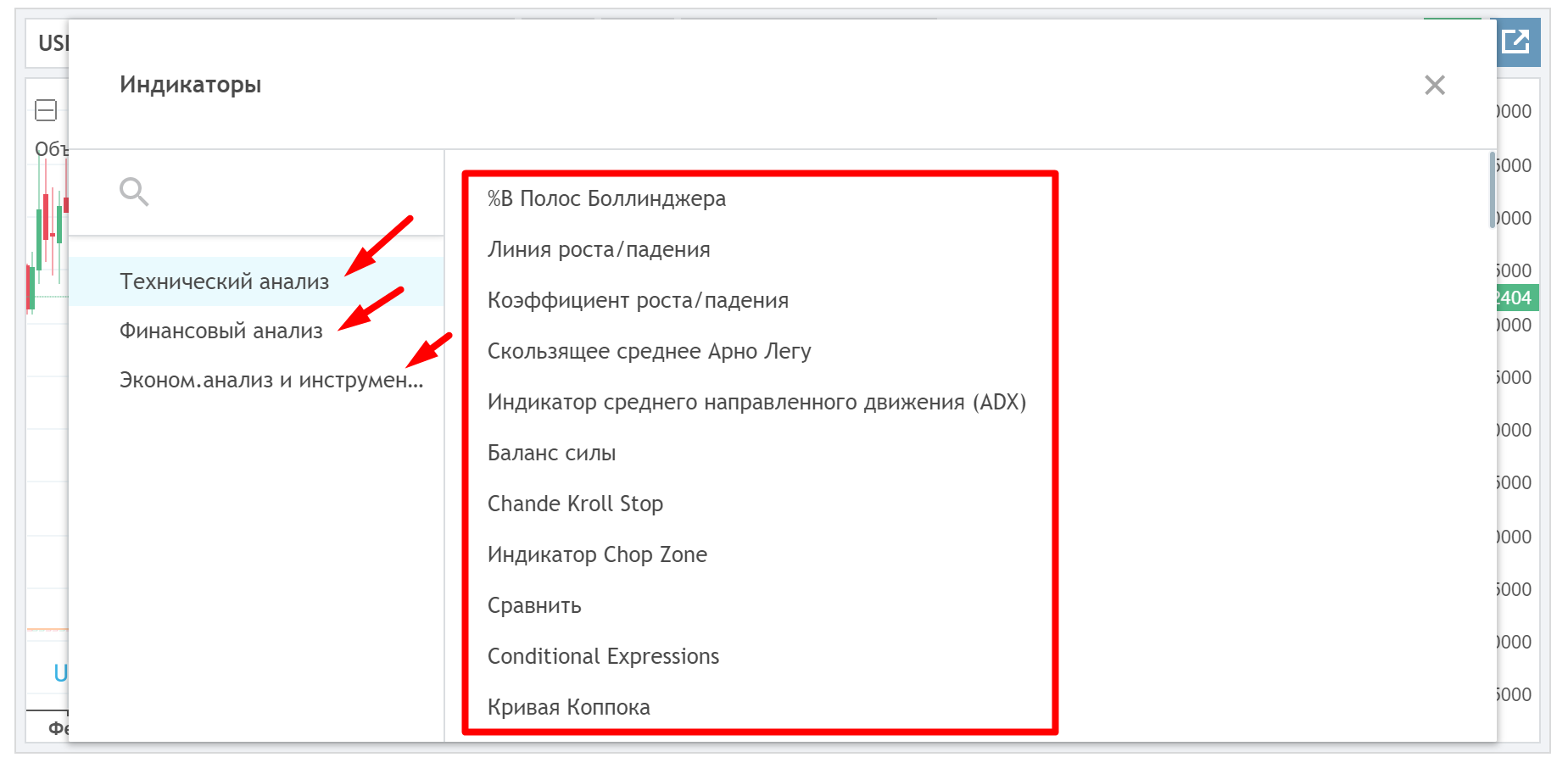 В появившемся окошке выбираем нужный тип индикаторов (слева) и далее – кликаем на называние интересующего индикатора.