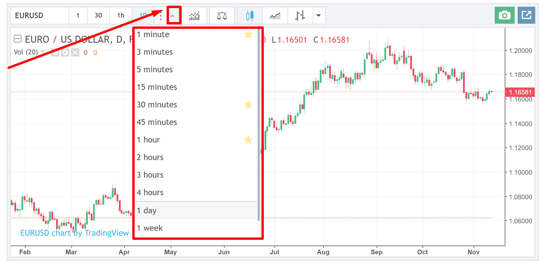 Временной период (таймфрейм) отображает время, за которое формируется на графике свеча или бар. По умолчанию на онлайн-графике установлены четыре временных периода — минута, 30 минут, час и день. Однако есть возможность выбрать другой таймфрейм. В выпадающем списке предлагаются различные периоды от минуты до недели.