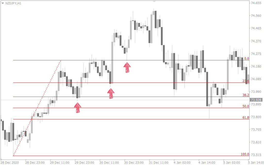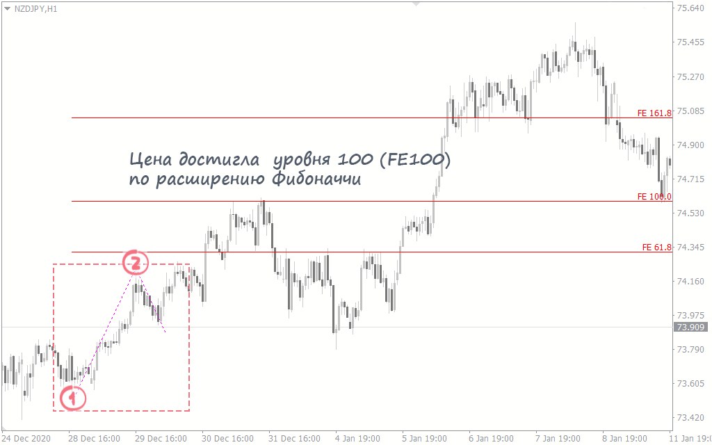 На графике ниже видно как работают расширения Фибоначчи. После того, как цена скорректировалась и вышла из зоны нулевого уровня, она направилась прямо к уровню 100.