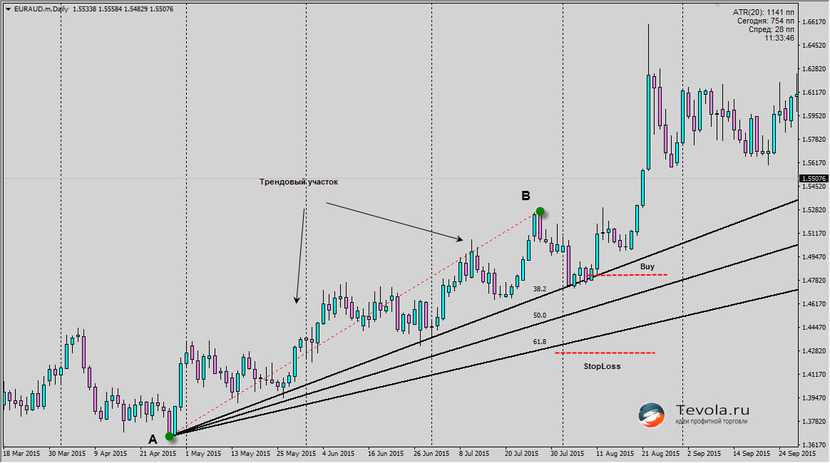 Посмотрите на одну из возможных сделок по паре EURAUD. Отчетливо виден трендовый участок, в котором можем определить максимум и минимум (точки А и В). По ходу тренда натягиваем фибо веер и следим за уровнями коррекции.