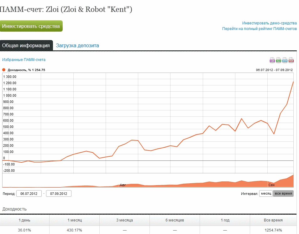 Здесь приведен пример крайне агрессивного счета — трейдеру повезло заработать с начала торговли 1250%, хотя в первый период счет был близок к сливу. Но для нас важен не результат, а то, что считается он именно по эквити, т.е. по графе «Средства» трейдера. Иначе говоря, за рассматриваемый период трейдер умножил средства в 13.5 раз.