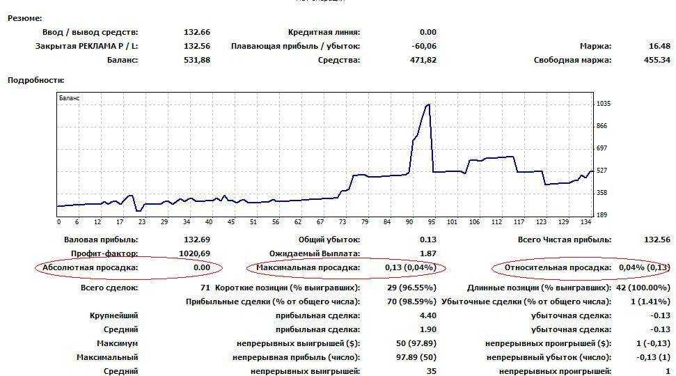 - просадку абсолютную и максимальную;
