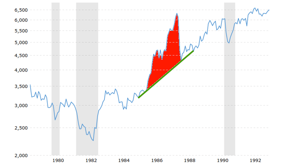 На фоне зелёной стрелки отчётливо видно, как с 1985 пузырь надувается, а потом лопается, и цена возвращается к справедливой стоимости. Заметьте, не падает на дно, как в 29, а именно выравнивается. Поэтому сравнение с Великой депрессией считаю преувеличением. Но не суть.
