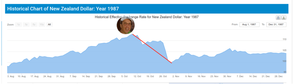 Его жертвой стал «Киви», новозеландский доллар — молодая валюта, которая только вышла в оборот только к началу 70-х и сильно выросла на фоне надувающегося пузыря фондового рынка.