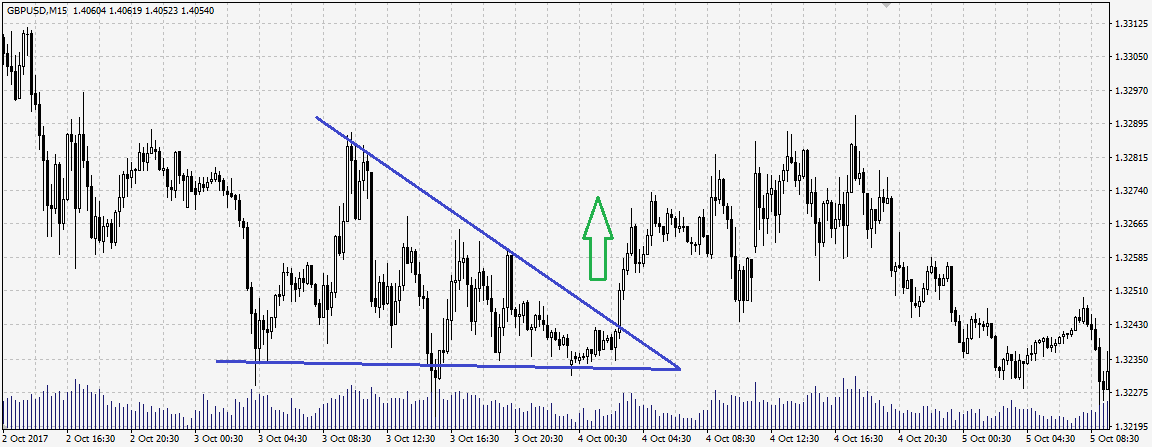 Торговый ордер открывается при прорыве ценой уровня поддержки или сопротивления. Но такая стратегия дает хорошие результаты только при наличии хорошо выраженного тренда — в этом случае сделки открываются в сторону его движения, поскольку цена в большинстве случаев после короткого периода неопределенности движется дальше, и может пройти приличный путь. Но в целом симметричная разновидность считается менее надежным сигналом к покупке, чем нисходящая или восходящая.