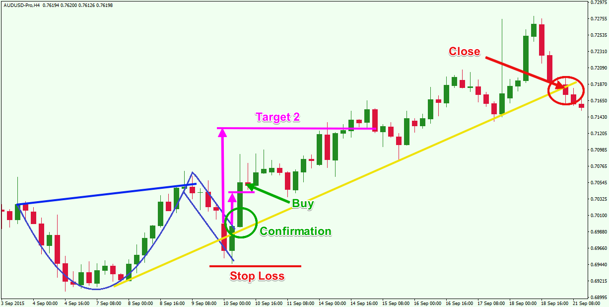 Как вы видите, цена достигла первой цели шаблона перед входом, если бы вы ждали, что свеча приблизится к ней. Иногда после этого ценовое действие достигает второй цели на графике. У вас есть возможность закрыть всю свою позицию на этой второй цели прибыли. Тем не менее, вы можете выбрать часть сделки для дальнейшего роста, если увидите, что действие цены продолжает расти вверх. Желтая линия на графике является восходящей линией тренда , которая измеряет бычье действие ценового действия. Вы можете держать сделку, пока действие цены находится выше линии желтого бычьего тренда. Прорыв линии тренда отображается в красном круге на графике, и это будет сигнализировать о подходящем времени, чтобы полностью закрыть торговлю.