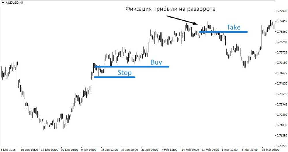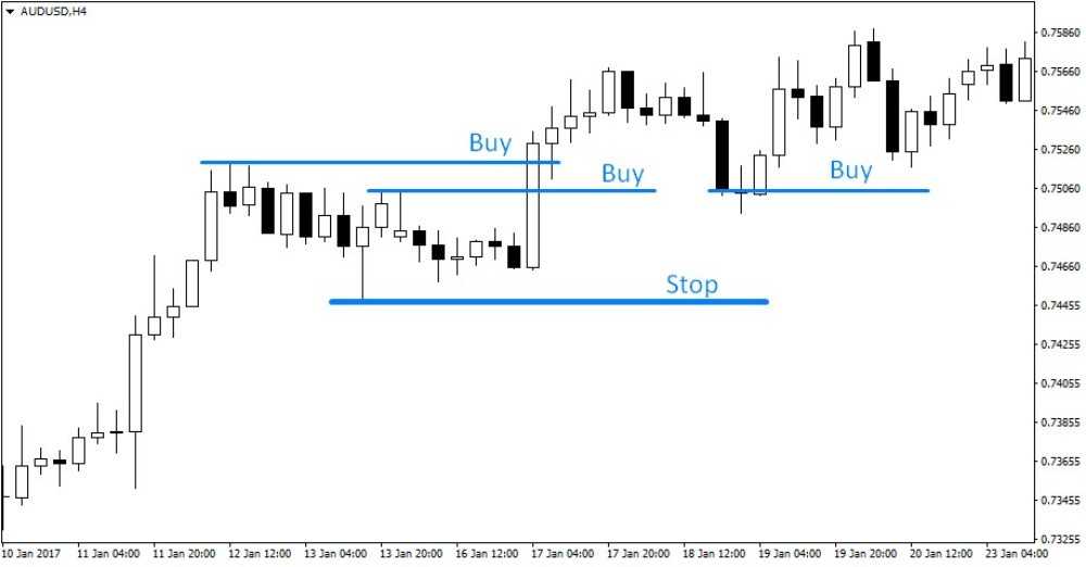 - Классический: вход в рынок в момент пробоя уровня сопротивления (по окончании формирования модели); установка стоп-лосса чуть ниже минимума пробойной свечи. Главная опасность — возможность слишком дальнего ухода цены.