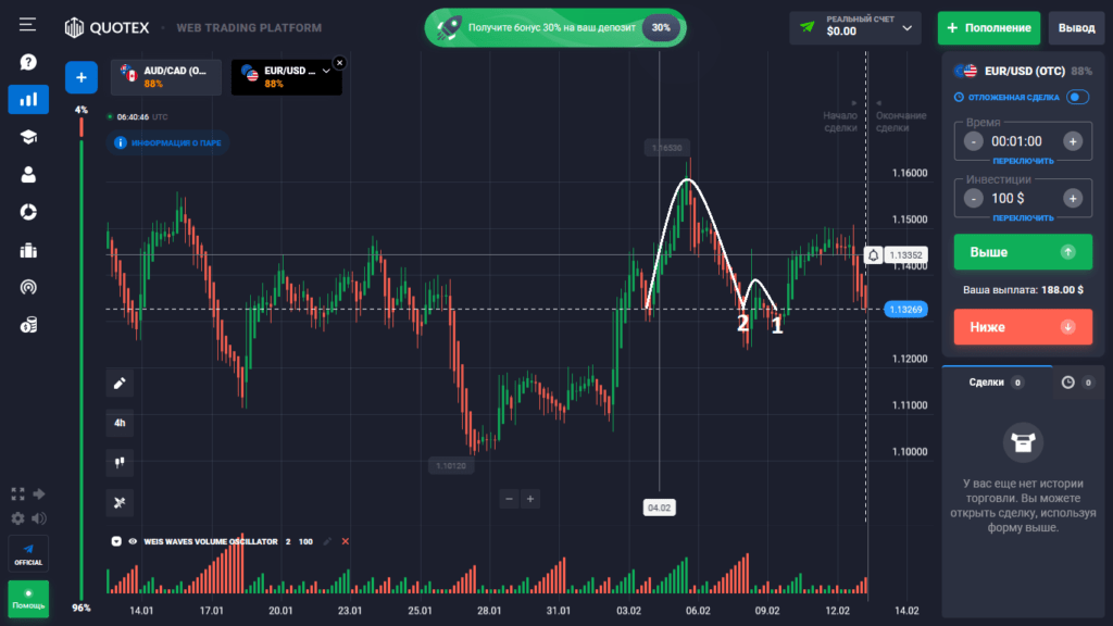 Еще один способ открытия ордера с низким риском – на заре отрисовки правой части. Хотя остается неизвестным цель по профиту, так как размах данной составляющей заранее неизвестен и в каждом отдельном случае уникален, минимальный размер стоп-лосса делает математическое ожидание торговой стратегии положительным. Хотя из-за небольшой частоты появления профит может быть не особо интересен активным биржевикам, но при четкой идентификации поможет заработать (на изображении этот момент обозначен цифрой 2).
