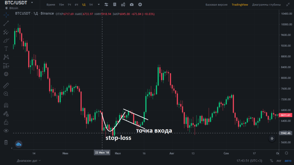 Следующий пример указан для криптовалютной пары BTC/USDT в Tradingview с указанием точек для открытия позиции и установки защитного ордера.