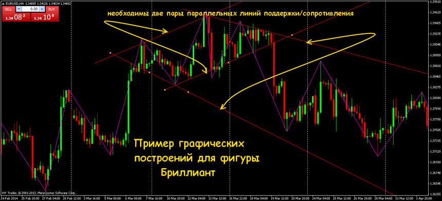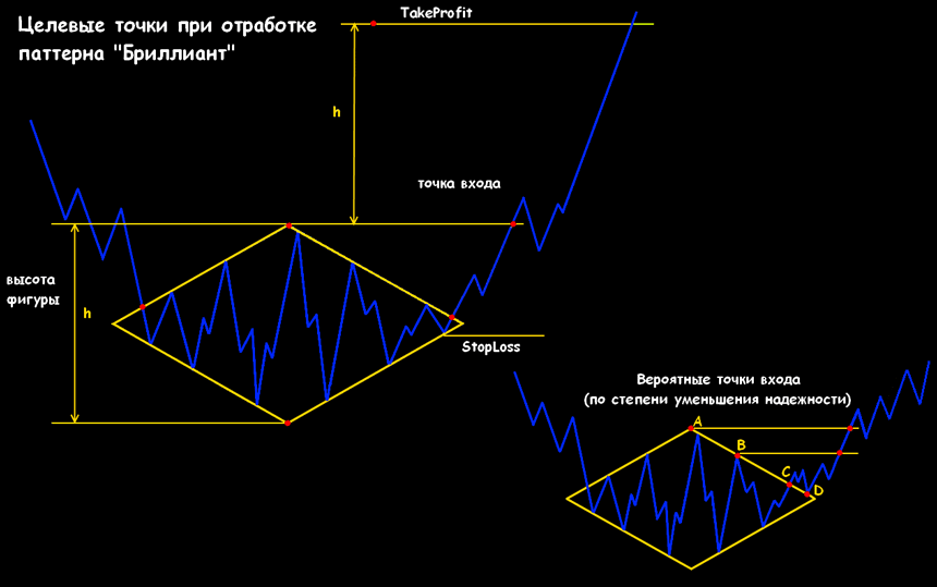 Торговать внутри визуально сформированного паттерна Бриллиант не рекомендуется, но если эта фигура сформировалась, например, на D1, то уверенным в себе скальперам можно стандартно торговать внутри дня и периодически контролировать глобальную модель.